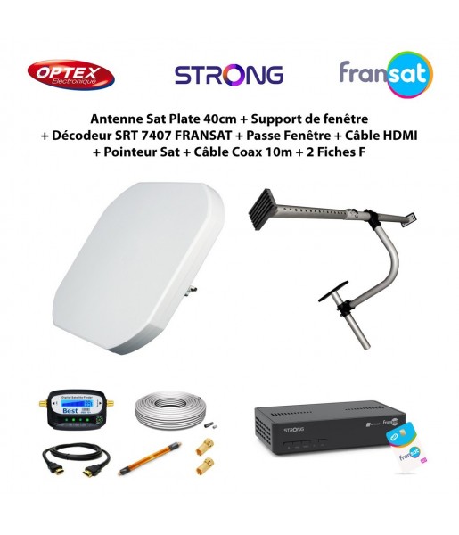 Antenne Sat Plate 40cm + Support de fenêtre + Décodeur SRT 7407 FRANSAT + Passe Fenêtre + Câble HDMI + Pointeur Sat + Câble Coax