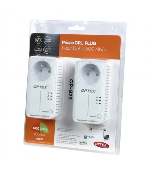 PACK 2 PRISES CPL 600 MBPS PLUG 725823 Ces adaptateurs CPL 600Mb/s (Courant porteur en ligne) vous permettront de vous connecter de n'importe quelle prise électrique de votre habitation, partagez vos informations et surfez sur internet ! Ils permettent de récupérer le signal réseau avec la connexion RJ45 au de vos prises électriques de votre réseau électrique existant. Caractéristiques : - Taux de transmission : Plus de 95Mb/s effectifs ; - Type de cryptage : 128 Bits de type AES ; - Standard CPL : LAN IEEE 1901 / HomePlug AV ; - Emballage : Blister taille 3 ; - Nbs de port RJ45 : 1 ; - Nombre de prise maxi : 16 ; - Alimentation : Prise secteur 100-240V 50/60Hz ; - Fréquence CPL : NC ; - Nbs voyant Led : 3 ; - Type de prise : CPL ; - Débit (Mb/s) : 600 ; - Mode d'utilisation : intérieur ; - Mode sécurité : WEP, WPA2-PSK, WPA-PSK ; - Description courte : 2 prises CPL 600 MBPS PLUG ; - Fonction WPS : Oui ; - Bouton de sélection : Oui ; - Connexion WLAN : Oui ; - Bouton marche/Arrêt : Oui ; - Connexion RJ45 : Oui ; - Longueur : 60.0 mm ; - Largeur : 70.0 mm ; - Hauteur : 116.0 mm. Contenu : - 2 prises CPL 500Mb/s ; - 2 cordon RJ45 ; - 1 CD-ROM.