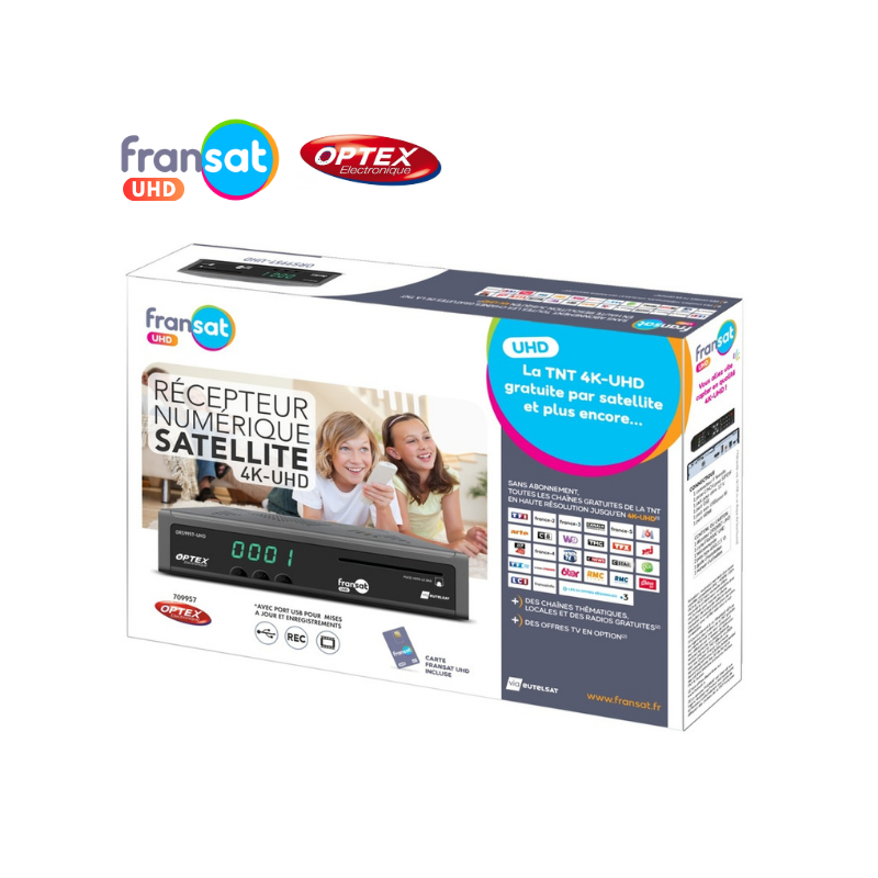 Profitez d’une qualité d’image exceptionnelle et d’un accès facile à vos chaînes préférées grâce à ce décodeur OPTEX Fransat UHD 4K avec carte incluse.