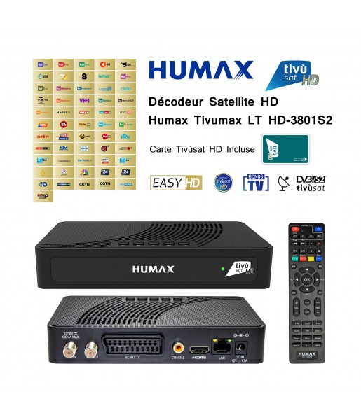 Le Pack Tivùsat Décodeur Satellite HD Humax Tivumax LT offre un accès gratuit à plus de 50 chaînes HD. Carte Tivùsat activée, installation simple et qualité d’image exceptionnelle.
