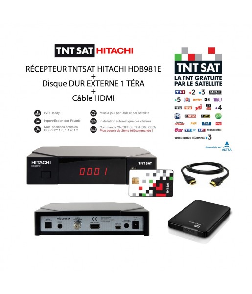 Récepteur TNTSAT simple et rapide à installer, l’Hitachi HDB981E permet de recevoir les chaînes de la TNT HD par satellite ASTRA. Avec le disque dur 1 To et le câble HDMI inclus, enregistrez et profitez de vos programmes en haute définition.