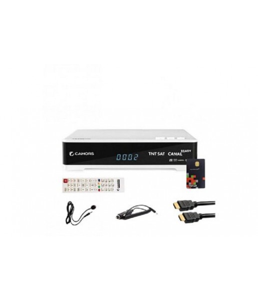 Récepteur TV satellite HD Cahors avec carte TNTSAT V6, enregistrement USB, son Dolby et câble 12V inclus, idéal pour maison et voyage.