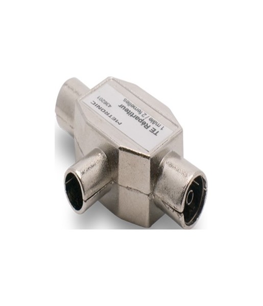 Répartiteur en «T», blindé, pour relier 2 fiches 9,52mm mâles et une femelle entre elles. Il assure le maintien de la qualité d’image sur les 2 TV tout en permettant d’alimenter un amplificateur de mât