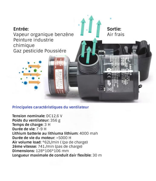 Système de respiration assistée alimenté électriquement, conçu pour un usage professionnel. Ce masque assure une protection optimale contre les vapeurs chimiques, gaz organiques et aérosols, tout en garantissant un confort d’utilisation prolongée grâce à son débit d’air constant et à son ventilateur portable.