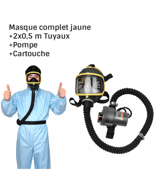Le système comprend un masque complet , une pompe à air à fixer à la taille pour plus de praticité, ainsi qu’un filtre performant contre divers gaz toxiques.