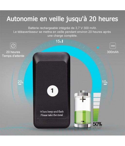 4. Temps de veille jusqu'à 20 heures : batterie rechargeable intégrée de 3,7 V 300 mAh. Le téléavertisseur reste en veille pendant environ 20 heures lorsqu'il est complètement chargé.