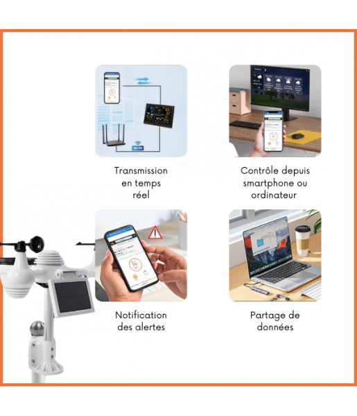 La Station Météo solaire 7-en-1 est l’outil idéal pour surveiller les conditions climatiques avec une précision professionnelle. Que ce soit pour un usage domestique, agricole ou professionnel, elle fournit des données fiables et accessibles en temps réel grâce à sa connectivité Wi-Fi.
