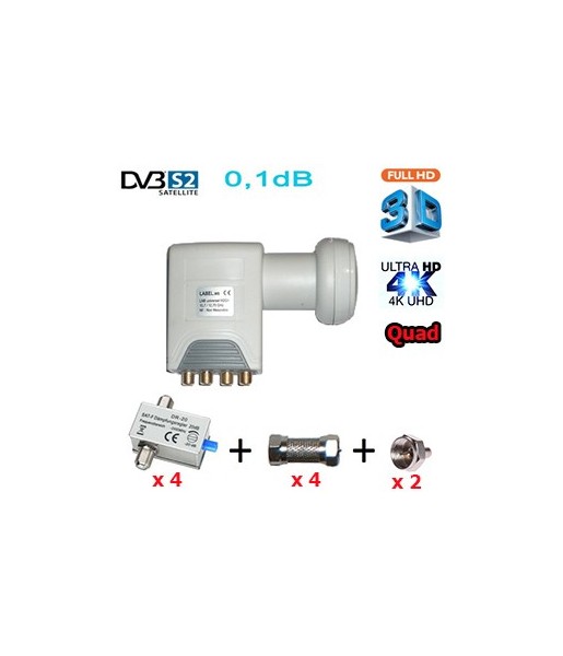 Kit LNB Quad 0,1 dB HDG2-QDNM avec accessoires complets. Réception satellite stable, HDTV et 3D Ready, idéale pour installations multi-téléviseurs.