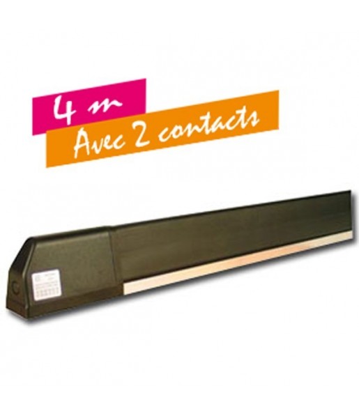 Tranche de sécurité homologuée, prémontée et redécoupable avec 2 contacts - 4 mètres Tranche de sécurité homologuée à contact, prémontée, redécoupable, longueur 4 mètres. La tranche de sécurité mécanique offre de nombreux avantages : - Sensibilité : réaction rapide pour une meilleure sécurité; - Usure faible : fonctionnement précis même en cas de détérioration du bourrelet; - Fonctionnement : sans alimentation et sans carte électronique annexe. Les tranches de sécurité sont obligatoires si la force du vantail est supérieure à 15 daN (15 kg). Dans le cas où le portail et la clôture ont des barreaux, il est conseillé de mettre un grillage fin sur la clôture sur tout le trajet du portail. Sinon, il faut prévoir une tranche de sécurité à chaque zone de cisaillement (Zc). Si plusieurs tranches de sécurité sont nécessaires, raccorder les contacts de celles-ci obligatoirement en série sur la centrale de commande.