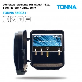 Coupleur terrestre TNT 3 entrées (VHF/UHF/UHFX) avec sortie unique, filtre 4G intégré et connecteurs F blindés pour une réception claire et stable en intérieur.