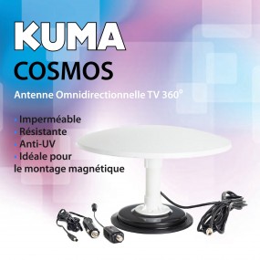 Antenne TV numérique omnidirectionnelle 360° KUMA avec amplificateur intégré, réception UHF/VHF stable sans orientation, idéale pour camping-car, caravane, bateau ou camion.