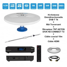 Kit Antenne Omnidirectionnelle DVB-T T4 + Mat Traversant + Récepteur TNT ASTON DIVA HD CONNECT T2 + Câble coaxial 10m + Câble HD