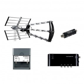 Ce kit à 4 sorties comprend : - un préamplificateur de mât à gain variable (20-38db max) ; - une alimentation 12V 4 sorties ; - une antenne d'extérieure Trinappe 26dB UHF avec Filtre 4G intégré.