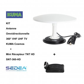 Profitez de la TNT HD en mobilité avec ce kit complet : antenne omnidirectionnelle 44 dB + mini récepteur SNT-360-HD, idéal pour camping-car, voiture, camion et bateau.
