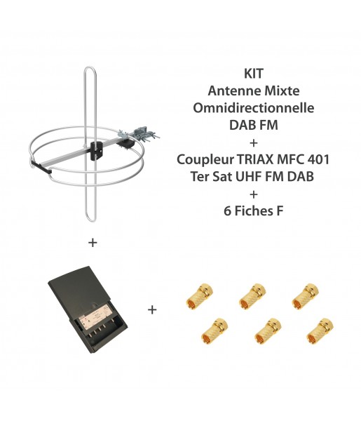 KIT Antenne mixte omnidirectionnelle DAB FM + Coupleur TRIAX MFC 401 Ter Sat UHF FM DAB + 6 Fiches F