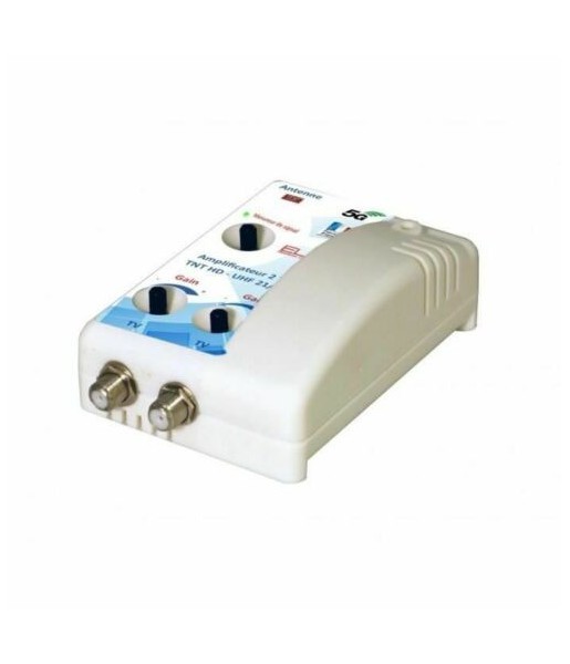 Amplificateur TNT 1 entrée / 2 sorties filtré 4G 15 à 35 dB Amplification de 1 à 2 TV Filtré contre la téléphonie 4G Gain réglable de 14 à 32 dB Réglage du gain et de la qualité du signal TNT Amplificateurs répartiteurs d'appartement blindés à alimentation 230 V~ intégrée Ces amplificateurs améliorent la qualité des signaux TNT en cas d'effet mosaïque, ils sont équipés d'un réglage de Qualité du signal qui diminue le taux d'erreurs du signal numérique. Les sorties multiples permettent de distribuer les signaux sur plusieurs (1 à 8) téléviseurs et/ou adaptateurs TNT. Équipement : Bande passante limitée à 800 MHz pour protéger l'installation des perturbations dues à la téléphonie 4G LTE · Consommation: 1,5 W (230 V~ / 50 Hz) · Entièrement blindé, connectique F femelle 75 Ω · 2 sorties · Bande passante : 470 à 800 MHz · Gain : 2 x 32 dB · Niveau de sortie : 105 dBμV · Facteur de bruit : inférieur à 1 dB · Réglage de gain : 18 dB · Dimensions (mm) : 74 x 100 x 38 Données techniques : Alimentation : 220 V AC · Type d'accessoire TNT : Amplificateur TNT Contenu de livraison : Ampli TNT Amplification de 1 à 2 TV Filtré contre la téléphonie 4G Gain réglable de 14 à 32 dB Réglage du gain et de la qualité du signal TNT