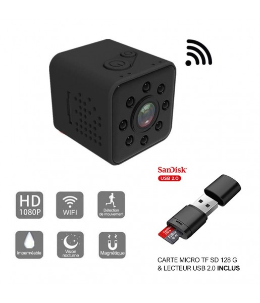 Mini caméra HD WiFi Petite Grand Angle 1080P Etanche Caméscope + Carte Micro TF SD 128Go + Lecteur USB 2.0 - DVR Sport Micro