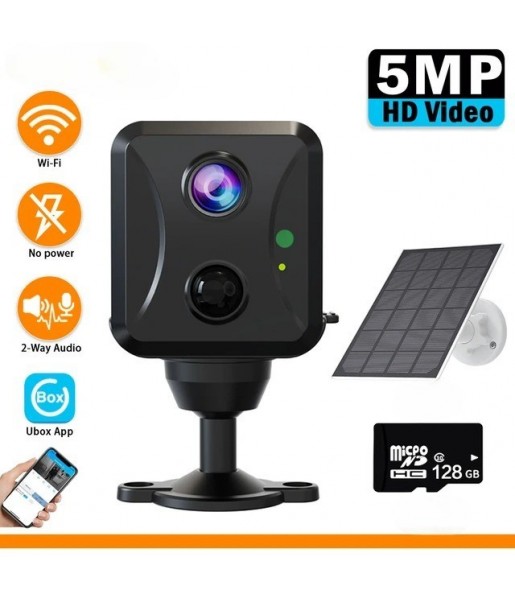 Mini caméra de sécurité solaire sans fil, caméra IP de surveillance avec panneau solaire, détection humaine, Wi-Fi, 5MP+ Carte TF 128 GO