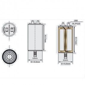 Condensateur permanent avec diélectrique en polypropylène métallisé non imprégné (construction sèche), fabriqué dans un récipient cylindrique et recouvert de PVC, et connexion électrique au moyen d'un tuyau. Assemblage mécanique par goujon fileté M8x1,25mm et écrou. L'application principale de ce type de condensateurs concerne les moteurs monophasés et peut également être utilisée dans les circuits de commutation, l'amortissement et les applications générales. Les condensateurs sont utilisés pour divers appareils électriques et électroménagers (réfrigérateur, congélateur, climatiseur, séchoir, pompe, portail électrique et de nombreux autres appareils.)