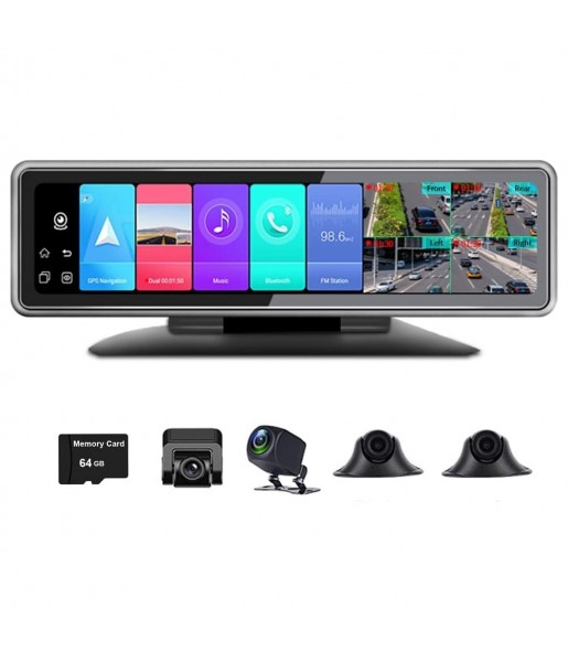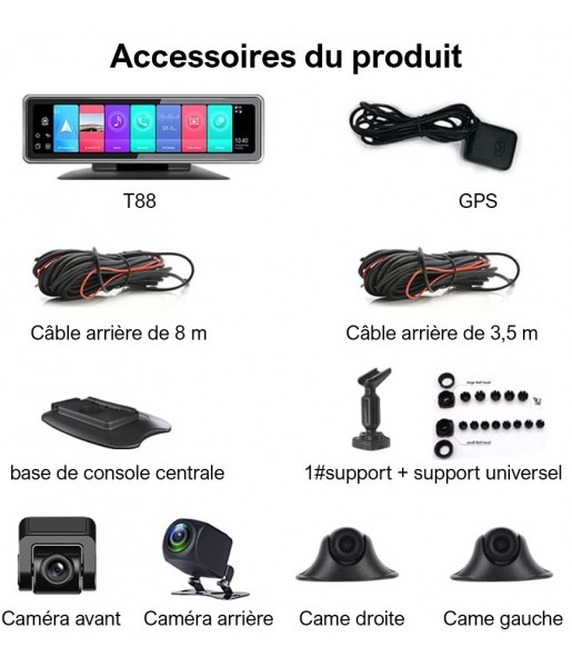 4G Dash Cam Android DVR 360° Ecran Panoramique 12 Pouces Avec 4 caméras d'enregistrement WiFi GPS Bluetooth Voiture Rétroviseur T88 1. Par défaut, le câble d'alimentation (B+,ACC,GND) connecté à la boîte à fusibles de l'automobile est envoyé : l'ACC rouge et le B+ jaune sont connectés à +12 V, et le GND noir est connecté à -12V. 2. Le produit n'a pas de radio, c'est un émetteur FM, lorsque l'émetteur FM est allumé, le produit perdra le son, définira un canal, l'autoradio est connecté à ce canal, puis jouera le son de l'appareil via l'autoradio. Caractéristiques : - Écran : écran tactile de 12 pouces ; - Système d'exploitation : Android 9.0 2+32 G ; - Navigation GPS : Beidou+ ; - Antenne GPS externe Bande Internet 3G/4G : 3G WCDMA B1/B5/B8 ; 4G TDD-LTE B38/B39/B40/B41 ; 4G FDD-LTE B1/B3 ; - Caméras : 4 cames enregistrant en même temps, avec fonction de vision nocturne ; - Angle de vue : 150 degrés ; - Résolution vidéo : enregistrement AHD720P en même temps ; - Code vidéo : H.264 ; - Format vidéo : T.S ; - Format d'image : JPEG ; - Stockage de mémoire : MAX 512G avec classe 10 ou supérieure (non inclus) ; - Installation : base de la console centrale ou le support spécial pour remplacer le rétroviseur d'origine La fonction d'APP Car Assist ; - Diffusion vidéo en direct : assistance ; - Vérification de l'historique de suivi GPS : assistance ; - Moniteur à distance mobile : assistance capture d'image ou de vidéo : prise en charge ; - Moniteur de stationnement 24h/24 : assistance message d'alarme : assistance fonction interphone : prise en charge. Contenu : - 1x hôte T88 ; - 1x caméra frontale ; - 1x caméra arrière ; - 1x came gauche avec câble 3.5 ; - 1x came droite avec câble 3.5 ; - 1 base de console centrale ; - 1x support ; - 1x + support universel ; - 1x manuel d'utilisation.