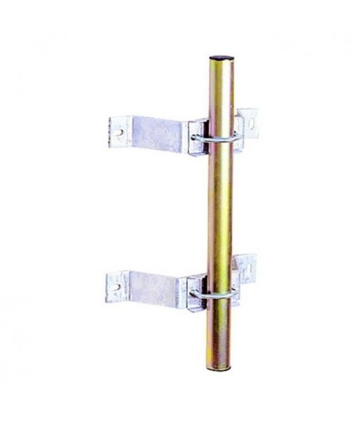 • fixation d’une grande antenne satellite (la placer entre les 2 fixations) • fixation de 2 antennes satellites moyennes (en placer une entre les 2 fixations) • montage avec une jambe de force pour rigidifier le montage. • montage avec chevilles métalliques ou chimiques sur mur plein. Détails du produit 2 fixations murales type ascenseur - Sans contre plaque - Déport 100 mm - Mât D= 30 à 50 mm - Galva