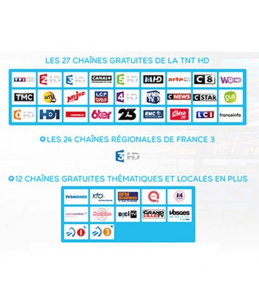 Grâce à ce terminal satellite Haute Définition et à la carte FRANSAT PC7 HD fournie, profitez sans attendre des 27 chaînes de la TNT gratuite en HD , ainsi que d’une sélection de chaînes locales/thématiques et des radios.