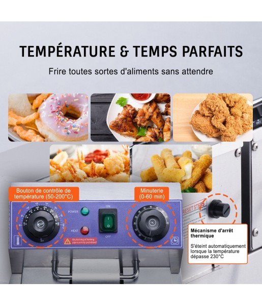 Friteuse Électrique Commerciale Friteuse à Huile 2 Cuves Acier Inox 12L 6000 W Un équipement idéal pour vos snack-bars, stands de concession, et bien plus encore ! La conception de la double cuve et du contrôle thermostatique indépendant vous permet de cuire deux aliments différents en même temps à des températures différentes. Friteuse Puissante Grâce à sa construction entièrement en acier inoxydable, elle est très facile à nettoyer et résiste aux conditions rigoureuses des cuisines commerciales. Réservoir d'Huile Deux réservoirs d'huile en acier inoxydable, d'une capacité de 12 L chacun, vous permettent de cuisiner deux types d'aliments différents en même temps. Panier à Frire Comprend deux paniers à frire de 185 x 205 x 100 mm, avec des crochets à l'avant et des poignées froides au toucher. Découvrez Différents Aliments En utilisant deux réservoirs d'huile séparés de 12 L, cette friteuse électrique vous permet de frire différents types d'aliments individuellement et de conserver les saveurs uniques de chacun. Elle dispose également de deux paniers amovibles spacieux d'une capacité de 4 L, ce qui vous permet de vidanger et de retirer rapidement les aliments de la friteuse. Elle convient parfaitement aux charcuteries, aux stands de concession, aux snack-bars et aux fêtes. Aliments Chauds Rapidement Cette friteuse à bain d'huile est équipée d'un élément chauffant de 3000 W dans chaque cuve, ce qui lui permet de chauffer l'huile à la température souhaitée en peu de temps. Vous pouvez facilement cuire vos aliments de manière rapide et complète. REMARQUE : Il est recommandé d'utiliser des plaques de prise de courant séparées pour chacune des deux fiches afin de minimiser le risque de perte de puissance inattendue (veuillez vous brancher dans une prise murale plutôt que dans une prise de type plaque de câblage). Réglez la Température & l'Heure Grâce à la commande thermostatique indépendante de chaque réservoir, vous pouvez facilement régler la température de 50 à 200 °C. Vous serez ainsi prêt à faire monter la température, quoi qu'il arrive ! Elle comprend également un mécanisme d'arrêt thermique, qui vous permet de couper le courant si l'huile atteint une température de 230 °C. De plus, la friteuse commerciale est conçue avec des minuteries, afin que vous ne manquiez rien. Vous pouvez régler le temps de 0 à 60 minutes en fonction de ce que vous cuisinez ! Détachement & Nettoyage Faciles Heureusement, son tube chauffant peut être facilement relevé, ce qui facilite le nettoyage après chaque utilisation. L'extérieur en acier inoxydable est facile à nettoyer. De plus, chaque réservoir est équipé d'un robinet de vidange monté à l'avant pour évacuer l'huile sans effort. Détaillé Juste pour Vous La poignée revêtue, au toucher froid, assure une utilisation confortable pour une durée de vie plus longue. Le couvercle bien adapté minimise les éclaboussures d'huile chaude. Deux supports en acier inoxydable sont posés au-dessus du tube chauffant et séparent le panier à frire, afin qu'il n'entre pas en contact avec l'élément chauffant. De plus, le crochet avant permet de suspendre facilement le panier pour vidanger l'huile rapidement. Caractéristiques : - Puissance : 1500W+1500W ; - Plage de température : 50-200°C ; - Plage de temps : 0-60 min ; - Longueur du cordon d'alimentation : 1,3 m ; - Matériau du tube chauffant : SUS 201 ; - Poids de l'article : 13,8 kg.