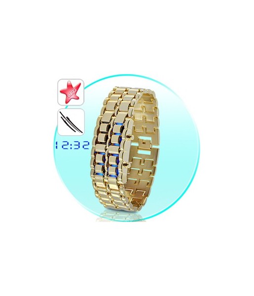 Une montre à LED bleues, un superbe bracelet dorée, la version "or" de notre montre futuriste Samurai, une nouvelle façon de lire l'heure. Vous pouvez enfin affirmer votre style unique en portant cette superbe montre à LED, futuriste, design et élégante : des chiffres bleus entourés d'or.