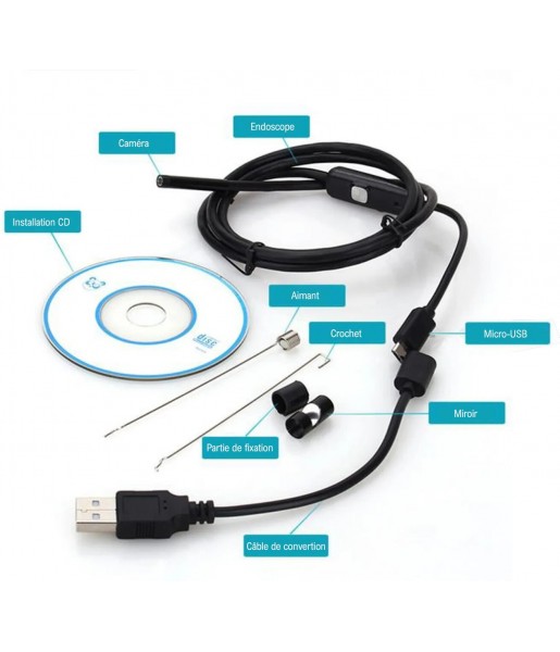 Endoscope étanche IP67 avec caméra mini HD de 7 mm de diamètre, câble de 2m, équipé de 6 LED puissantes, d’un crochet, d’un aimant et d’un miroir pour explorer les espaces difficiles d'accès.