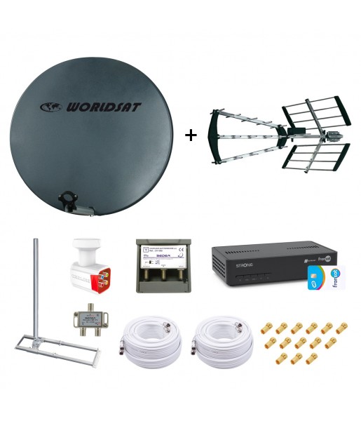 Kit Parabole Fibre SMC 75cm Anthracite WORLDSAT + Antenne TNT UHF Trinappe + Support Chevron Toit Profi-Line + LNB Quad HD 4K + Coupleur SAT TV + Découpleur intérieur SAT TV + Décodeur Strong SRT 7407 Fransat + 2 Câbles Coax Twin 25m + 14 Fiches F