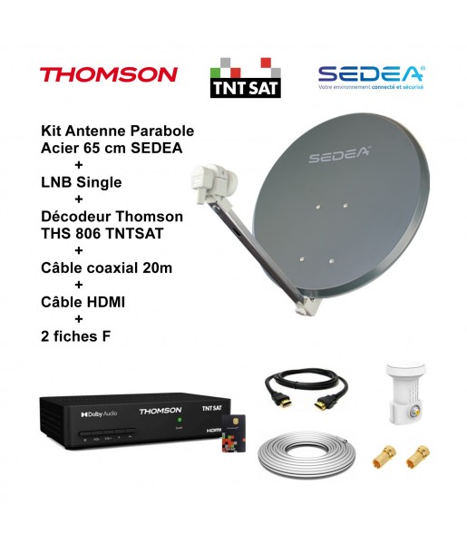 Kit Antenne Parabole Acier 65 cm 36,5 dB Anthracite SEDEA + LNB Single Full HD 4K Ultra HD + Décodeur Thomson THS 806 TNTSAT + Câble coaxial 20m + Câble HDMI + 2 Fiches F.