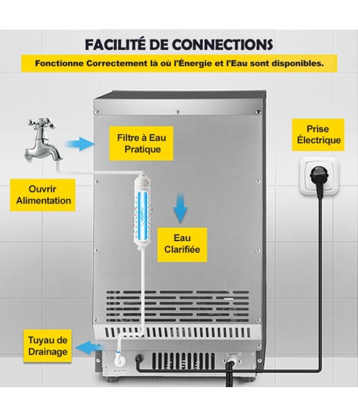 - Filtre à eau, Bac à Glaçon, Tuyau d'évacuation, Pelle à glace, Câble d'alimentation