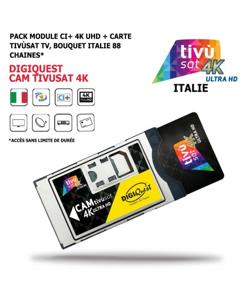 Pack Module CI+ CAM Tivusat 4K + Carte Bouquet Tv Italien Digiquest 88 chaines Ultra, HD, via le Satellite HOTBIRD 13 EST