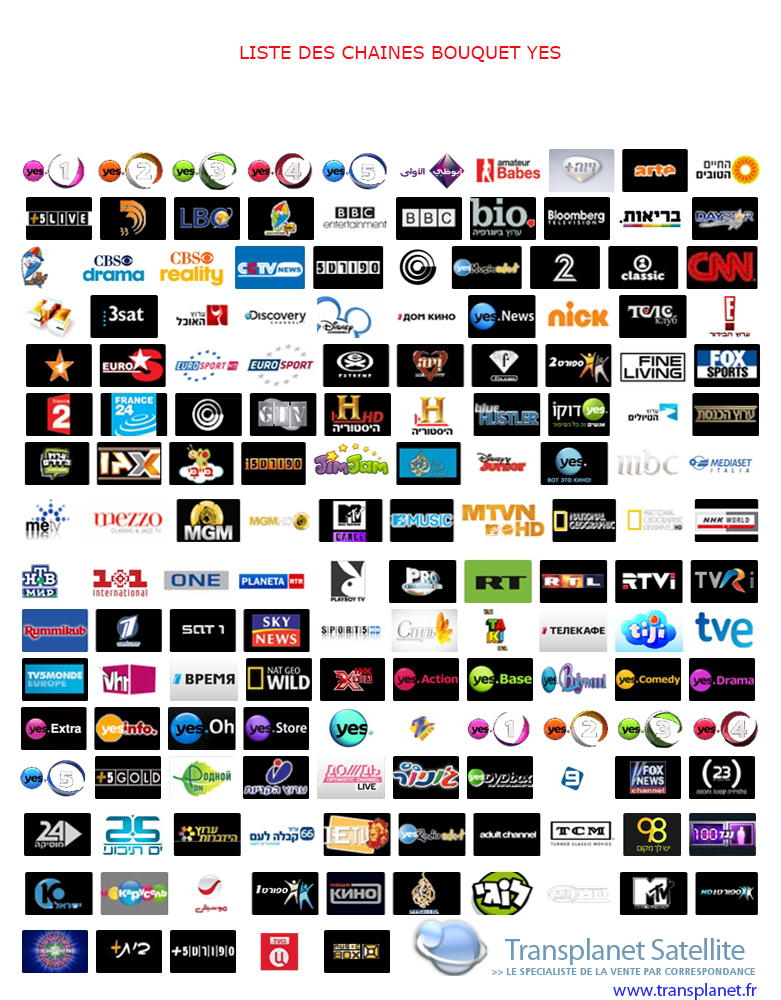yes 1 (Drama and Romantic comedies), yes 2 (Sci-Fi, Horror, Thrillers and Comedies), yes 3 (foreign and independent films), yes 4 (Action and adventure), yes 5 (Kids and family), Yes Extra, MGM Channel, yes Docu, Channel 9, Channel 10, Channel 1, Yes Drama, Yes Action, Yes Oh, Yes Comedy, Yes Base, Viva Israel, Big Brother Live, Channel 2, Israeli Educational Television, Israeli Music Channel, E! Channel, Home and Family Channel, Food Channel, Traveling Channel, Health Channel, Good Life Channel, BBC Entertainment, Channel 33, Discovery Channel, National Geographic Channel, NG Wild, History, BIO., Hop! Childhood, BabyTV, Jim Jam, Hop!, Disney Junior (Israel), Disney Channel Israel, Arutz HaYeladim, Nickelodeon Israel, Logi Channel, Junior Israel, Fox Sports Israel, Sport 1, Sport 2, Sport 5, Sport 5+, +5 GOLD, +5 LIVE, Extreme Sports Channel, Fashion TV, The Karaoke Channel, Mezzo, MTV Dance, VH1 Classic, MTV Israel, VH1 Europe, MTV Music, Adult Channel, Playboy TV, Blue Hustler Israel, Amateur Babes, TCM, Yes India, Yes Astrology, Yes Play, Interactive Portal, Mikan, Knesset Channel, Yes Store, Yes News, CNN International (US), Sky News International (UK), France 24 (France), Fox News Channel (US), Bloomberg International (UK), BBC World News (UK), Al Jazeera English (Qatar), Channel NewsAsia (Singapore), Daystar TV, CCTV News (China), RT - Russia Today (Russia), NHK World TV (Japan), RTL (Germany), 3sat(Germany), GTV Israel, TVR International(Romania), Pro TV Internaţional (Romania), Al Aoula Middle East (Morocco), TV5MONDE (France), France 2 (France), Arte (France/Germany), EuroStar (Turkey), MBC (United Arab Emirates), LBC Sat (Lebano), JRTV Al Ordoniyah (Jordan), Rotana Mousica (Saudi Arabia), Abu Dhabi Al Oula (United Arab Emirates), Al Jazeera (Qatar), 1+1 International (Ukraine), Perviy Kanal Europa (Russia), RTR Planeta (Russia), RTVi (Russia), Lubimoe Kino (Russia), Yes Teleclub, Dozhd (Russia), Zone Romantica, Viva Platina.