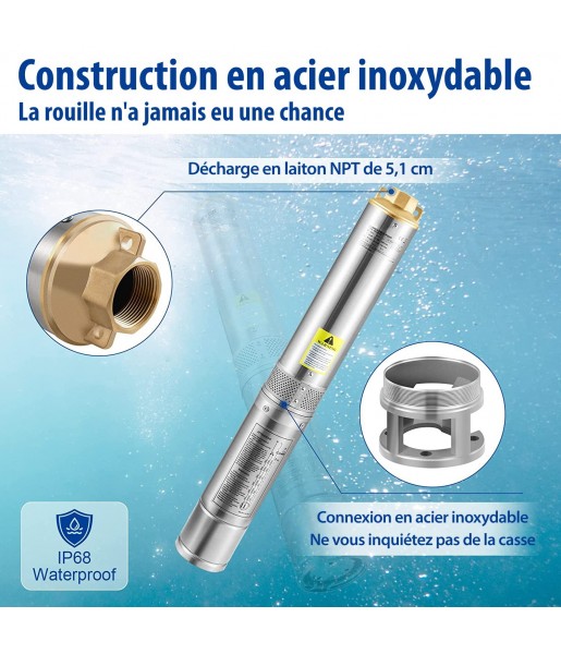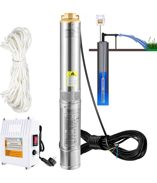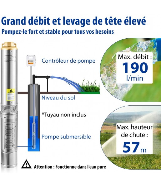 Pompe Immergée pour Puits 190 L /min 57 m Pompe à Eau pour Puits Profond en Acier Inox, Électrique 1100 W Débit et Tête de Pompe Améliorés Puissance : 1100 W, 230 V ; Résistant au sable : < 5 % ; Diamètre : 10,2 cm (pour un tubage de puits de 10,2 cm ou plus) ; Décharge : 5,1 cm NPT. Cette pompe submersible pour puits profonds est conçue avec des roues en thermoplastique à 9 étages, fournissant un débit maximal de 190 L/min et une hauteur manométrique maximale de 57 m. Il est livré avec un boîtier de commande externe et un cordon électrique de 20 m. Acier Inoxydable Amélioré L'ensemble du cadre de notre pompe à puits profond ne ressemble à rien sur le marché. Il est composé d'un corps en acier inoxydable et d'une sortie en laiton. Vous n'avez pas à vous soucier de la rouille ou de la corrosion après avoir été sous l'eau pendant une longue période. Avec un degré d'étanchéité IP68, la pompe peut être utilisée durant 8 à 10 ans. Moteur en Cuivre Fiable Vous en avez assez des pompes de puits submersibles précédentes qui vous échouent ? Le moteur en cuivre et le rotor de haute précision promettent un fonctionnement stable à long terme. Le moteur est doté d'une protection intégrée contre les surcharges, lui permettant de s'arrêter automatiquement lorsqu'il est bloqué ou lors de situations anormales pour éviter les brûlures. AVIS : NE PAS l'utiliser sans eau. Clapet Anti-retour et Filtre sans Problème Cette pompe de puits a un clapet anti-retour intégré pour empêcher le reflux (un clapet anti-retour supplémentaire est fortement recommandé). La maille de filtration en acier inoxydable est conçue pour filtrer les impuretés. Vous pouvez ajouter une couche de gaze devant l'entrée de filtration pour un nouveau puits foré qui peut contenir un sédiment granulaire excessif. Gardez les impuretés sans mal de tête. Utilisation Diverse Que vous souhaitiez résoudre des problèmes d'approvisionnement en eau pour l'industrie, les terres agricoles ou la maison, cette pompe de puits d'eau profonde est celle en laquelle vous pouvez avoir confiance. Il fonctionne parfaitement comme source d'eau de jardin et arroseur pour les enfants. Vous pouvez utiliser la pompe pour extraire de l'eau des puits, des réservoirs, des canaux, des rivières et d'autres ouvrages de pompage.