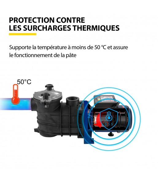 Le moteur de la pompe de piscine dispose d'une protection intégrée contre les surcharges thermiques et offre une protection contre la pression. La pompe de piscine peut supporter une température de 122℉/50℃ et assure un fonctionnement plus frais.