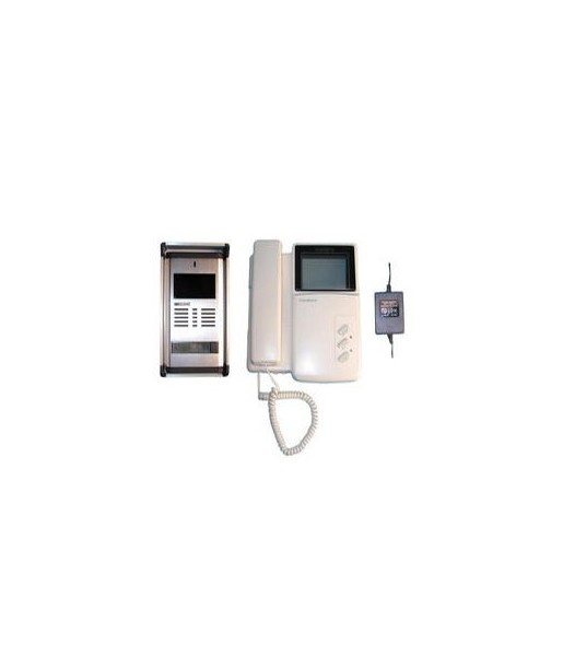 Composition de l’ensemble : 1 platine caméra métallique en applique ou encastrable (selon le boîtier), 1 moniteur vidéo d’appartement, 1 adaptateur 230Vca/18Vcc