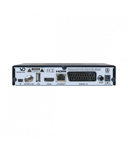 - Connecteurs : Entrée SAT, HDMI, 1 sortie Péritel, S/PDIF coaxiale, USB 2.0, déport infrarouge, entrée d’alimentation, port de service Ethernet ;