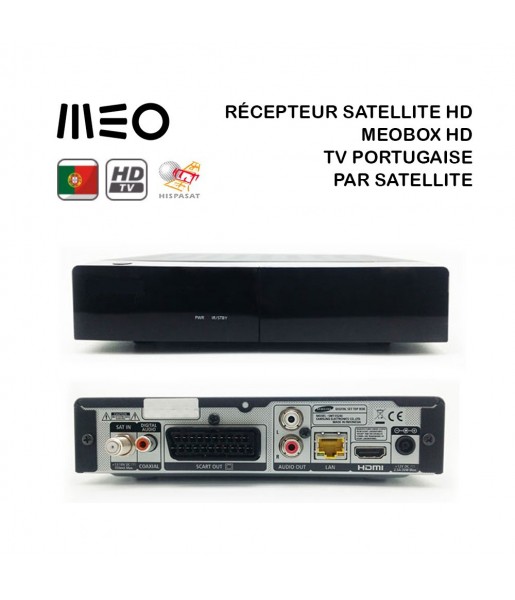 Récepteur Satellite HD MeoBox HD - Télévision Portugaise Par Satellite Récepteur Haute définition avec carte pour vous abonner aux offres du bouquet MEO. Disponible sur le satellite Hispasat 30W-5. 2. Je choisis mon abonnement (voir prix dans les tarifs ci-dessus). Les mensualités correspondantes sont prélevées directement par Meo sur votre compte bancaire : nous vous contacterons par téléphone pour mettre en place le prélèvement. a. Formule choisie ; b. Vous disposez de documents Portugais : - Copie de votre BI ; - N° contribuent, (NIF) ; - Justificatif de domicile de votre résidence au Portugal. 3. Je reçois mon récepteur actif directement chez moi. Je branche mon récepteur et je profite tout de suite de mes programmes préférés. - Light - √ 20 chaînes - 13.99€ /mois (pendant 24 mois), puis 19.49€ /mois ; - Top - √ 90 chaînes - 20.99€ /mois (pendant 24 mois), puis 26.49€ /mois ; - Mega - √ 110 chaînes - 25.99€ /mois (pendant 24 mois), puis 31.49€ /mois ; - Ultra Sport TV HD - √ 28 chaînes - 40,49 € / mois (pendant 24 mois) ; - Top Sport TV HD - √ 98 chaînes - 46.99€ /mois (pendant 24 mois). Les mensualités seront prélevées directement par Meo sur votre compte bancaire au Portugal. Attention ! Pour vous abonner à Meo, vous devez disposer de documents portugais, et d'un compte bancaire établi au Portugal. Il n'est pas possible de régler au comptant par tout autre moyen de paiement. Caractéristiques techniques : - Désignation : MeoBox Satélite HD ; - Récepteur : SAT ; - Définition : Haute Définition ; - Contrôle d'accès : VideoGuard ; - Lecteur de carte : 1 ; - Opérateur : Méo Satélite ; - Aspect ratio : 4:3, 16:9 ; - Standard de compression : MPEG2, MPEG4 ; - Transmission : DVB-S, DVB-S2 ; - Tuner satellite : Single ; - Modulation SAT : 8PSK, QPSK ; - Type de connecteur Sat : F - Femelle ; - RCA Audio/Vidéo analogique : 2 ; - RCA audio numérique digital (SPDIF) : 1 ; - HDMI : 1 ; - Péritel : 1 ; - USB 2.0 : 1 ; - Ethernet / RJ45 : 1 ; - Langues OSD : Portugais ; - Garantie : 2 ans. Contenu du colis : - MeoBox Satélite HD ; - Carte d'accès ; - Télécommande ; - Notice d'utilisation ; - Câble d'alimentation ; - Cordon péritel.