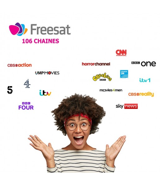 Ce pack contient un récepteur décodeur satellite enregistreur 4k Tv Box 2To et un bouquet Free Sat Tv, diffusées via le satellite Astra 2 à 28.2°Est, sans limite de durée. Cette offre contient 106 chaines, retrouvez des chaines nationales et internationales comme Channel 5, 5USA, 5USA+1, BBC Four, BET, Channel 4, Channel 4+1, Channel 5+1, E4, ITV+1, ITV2, ITV2+1, ITV3, ITV3+1, ITV4, ITV4+1, More4, More4+1, S4C, ITV London, UMP Movies, CBS Drama, CBS Action, Film4, FilmFour+1, Horror Channel+1, Movies4Men, Movies4Men+1, True Movies 1, True Movies 2, Horror Channel, Sky News, France 24, EuroNews, BBC News, ainsi que pleins d’autres chaines.