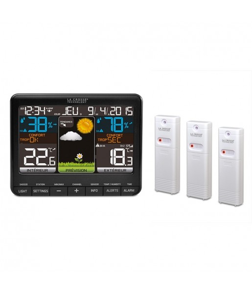 Station Météo avec écran LCD coloré, alertes de température, icônes de prévision animées 433 MHz et 3 capteurs extérieurs.