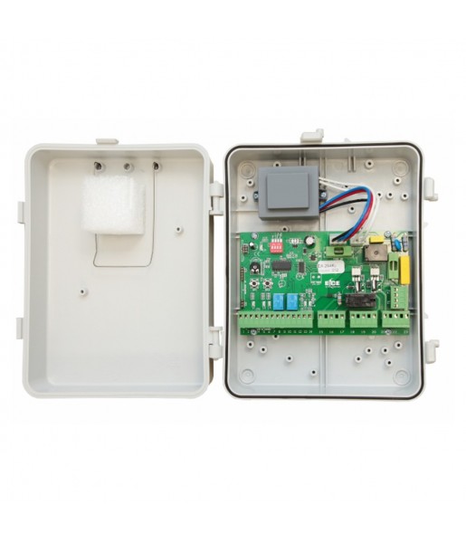 L'armoire de commande possède 2 programmes : ouverture totale et piétonne, elle permet un ralentissement en ouverture et fermeture, une fermeture semi-automatique ou automatique, un réglage de puissance des moteurs, ouverture maximale 120°.