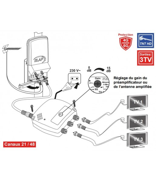 3 sorties TV : permet de brancher plusieurs téléviseurs sans perte significative de signal.