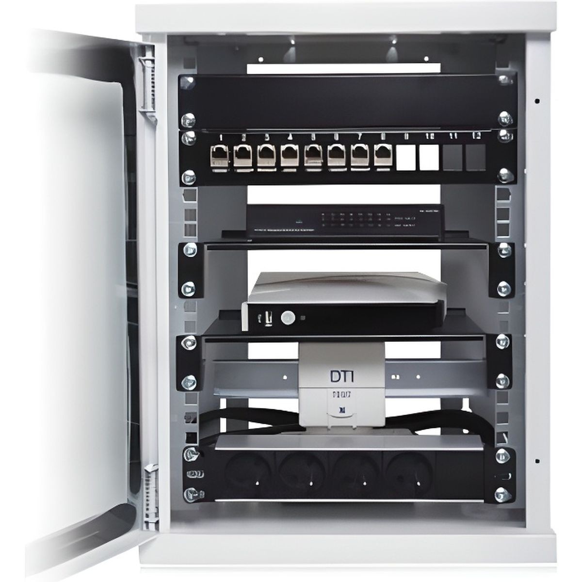 • Équipement complet inclus : étagère fixe, support RAIL DIN, panneau de distribution, panneau de brassage RJ45, cordons Cat.6 et embases Keystone Cat.6