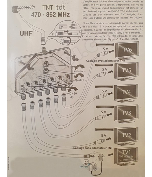L’amplificateur doit être alimenté par une des ses sorties en 5V, dans le cas d’une TV avec TNT intégré, il est nécessaire d’utiliser une alimentation «by pass» Réf.360008.