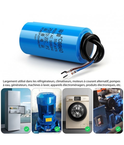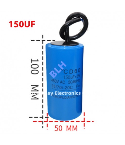 Condensateur de démarrage avec coque en plastique, cellule électrolytique, CD60, 450V, 450ylique, 150UF Les condensateurs de démarrage sont largement utilisés dans les réfrigérateurs, climatiseurs, moteurs à courant alternatif, pompes à eau, générateurs, machines à laver, appareils électroménagers, produits électroniques, etc.