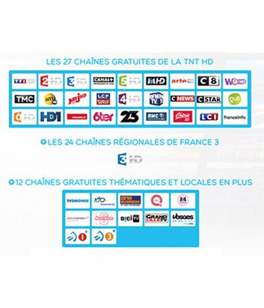 • Réception des 27 chaînes de la TNT HD gratuite via le satellite Eutelsat 5W.