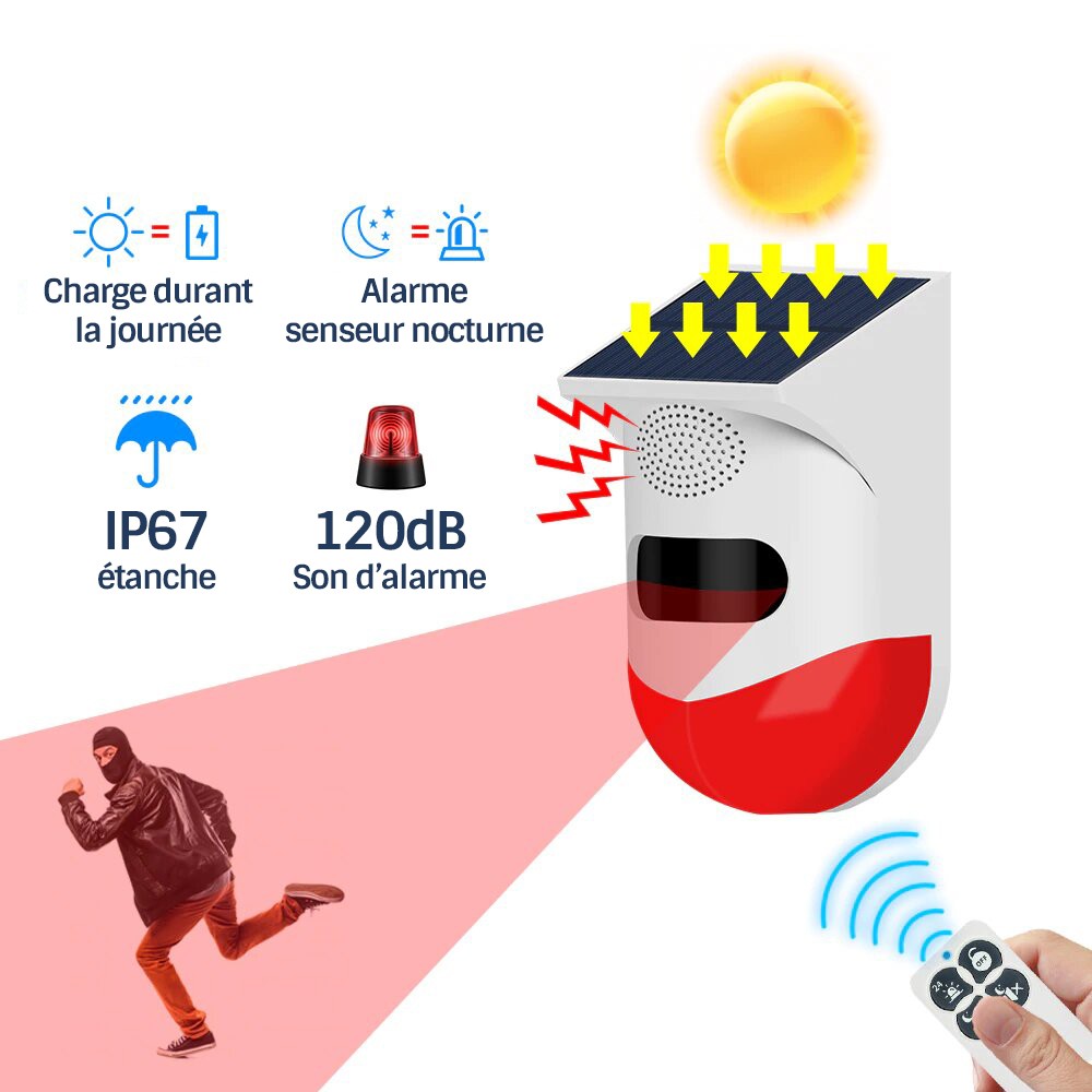 Wifi Alarme intelligente et solaire avec capteur infrarouge, alarme 120 dB, 7 modes, télécommande sans fil et étanchéité IP67. Détection précise, autonomie jusqu’à 2 mois.