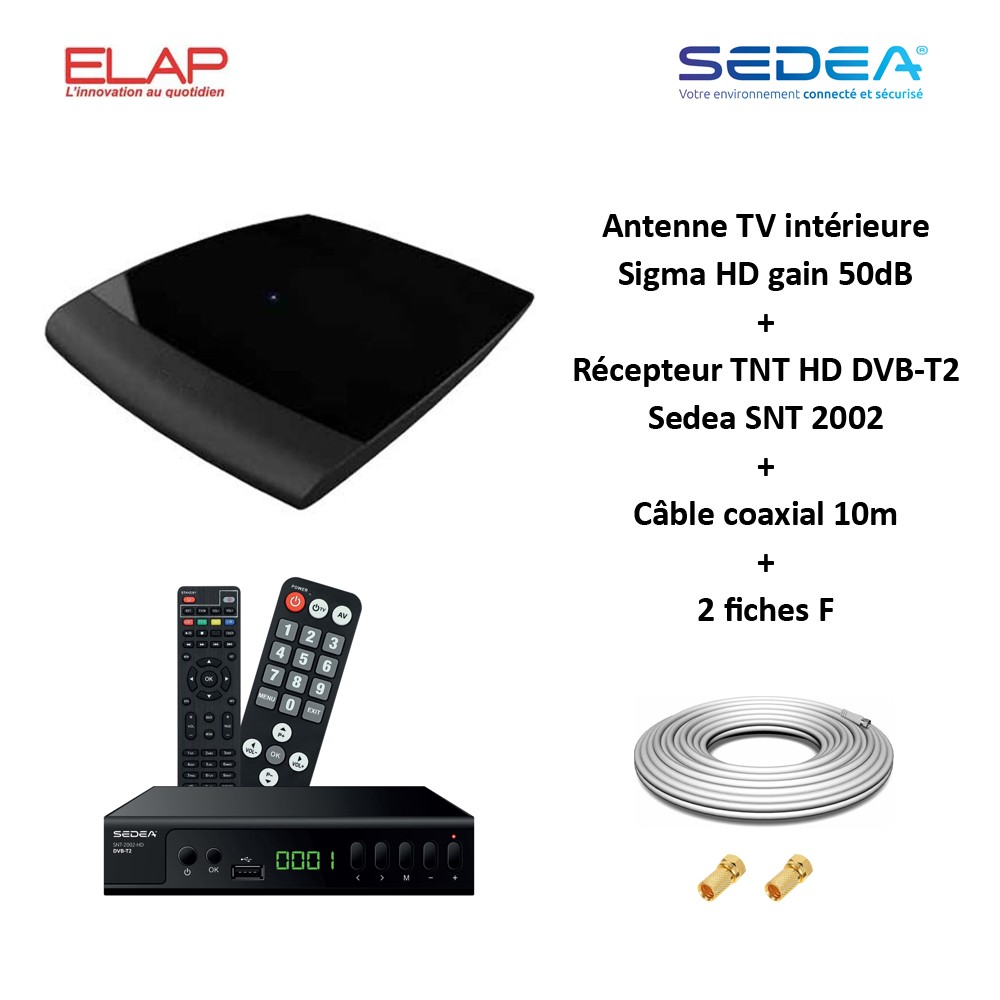 Pack antenne intérieure Sigma HD 50 dB avec filtre 4G + récepteur DVB-T2 SEDEA + câble 10 m. Réception puissante et installation immédiate.