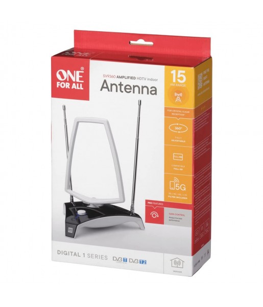 Antenne TV TNT / DVB-B UHF/VHF/FM Intérieur ONE FOR ALL SV9360 EU Numérique - Amplifiée, Gain 45 dB, Compatible HD, Filtre 3G 4G